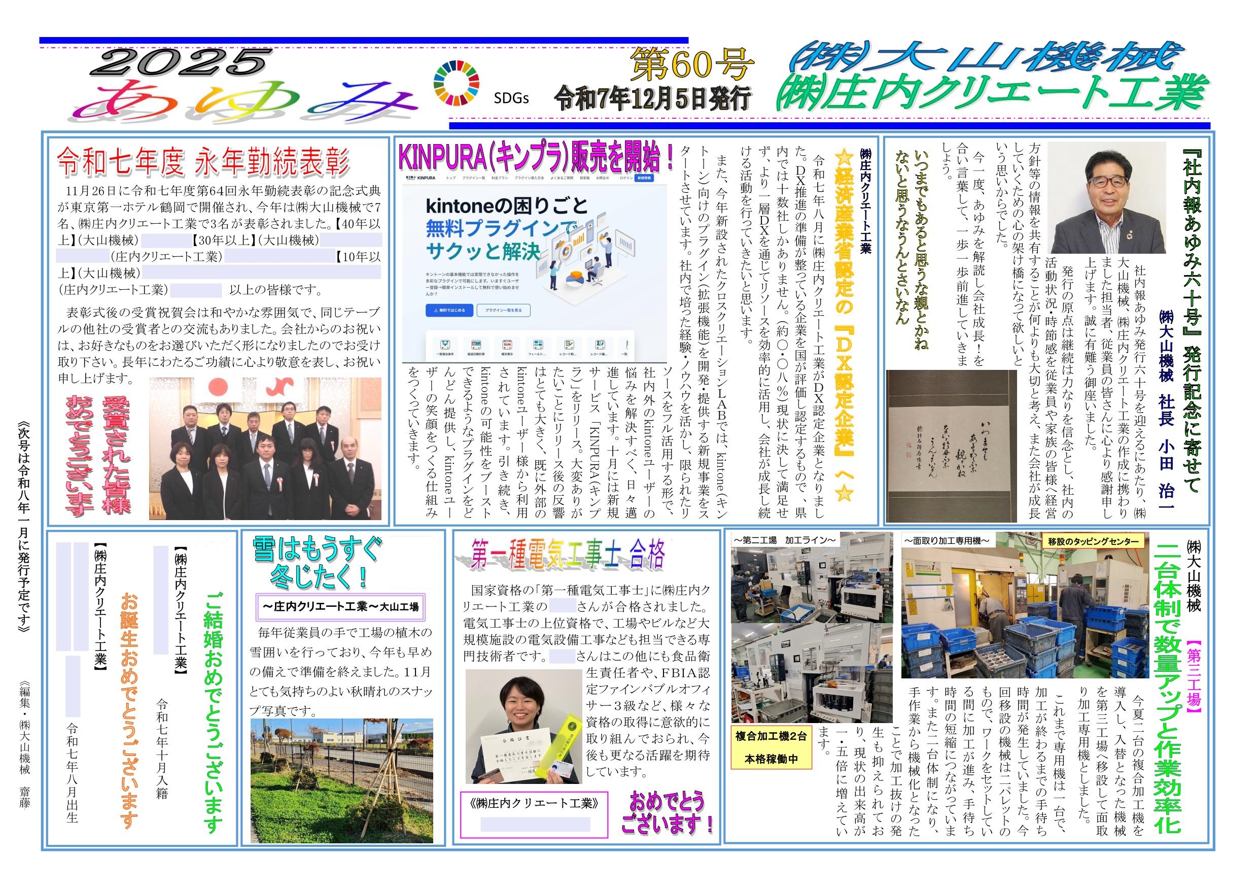 社内報「あゆみ60号」発行 2025/12/08 社内報「あゆみ60号」を発行いたしました。第三工場での作業効率化について紹介しています。詳しい内容はこちらからご覧ください。 次号は2026年1月に発行を予定しております。