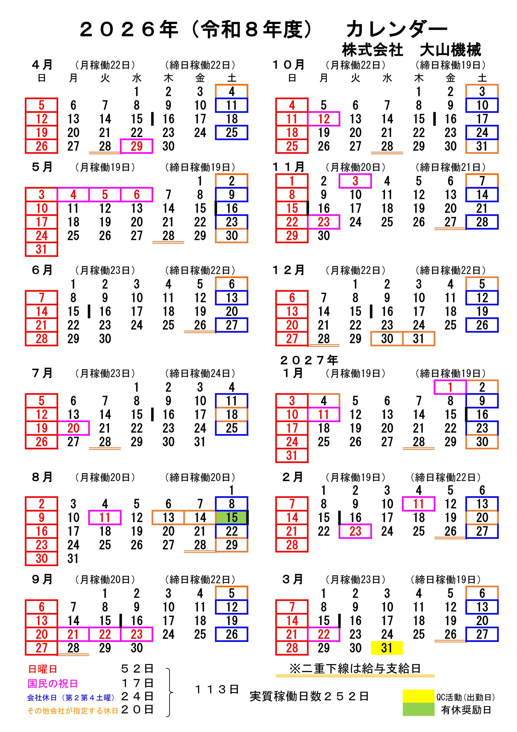 株式会社大山機械 2026年(令和8年度)会社カレンダーです。